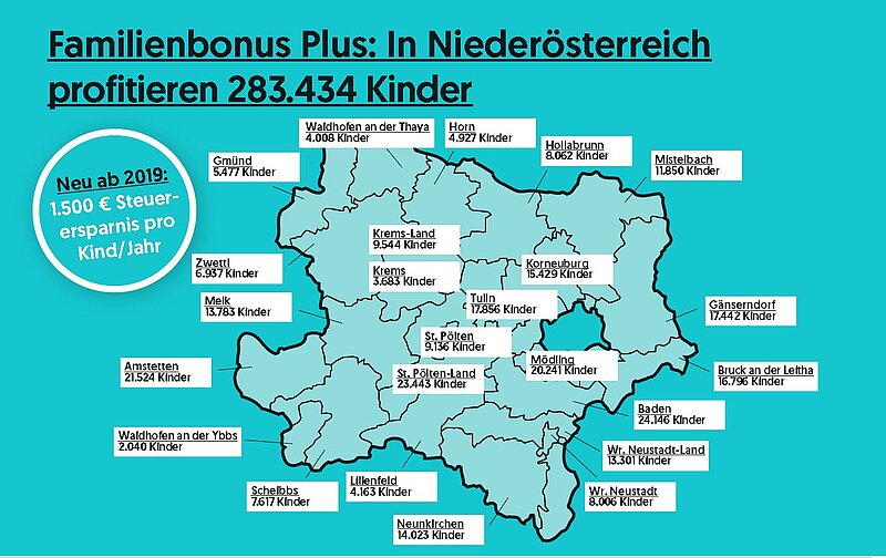 Der neue „Familienbonus Plus“ wird nach aktuelle Zahlen auch im Bezirk Baden vielen Familien zu Gute kommen. Dazu LAbg. Christioph Kainz: „Wir wollen Partner der Familien sein und nicht Vormund der Eltern! Eltern, die Beruf und Kindererziehung unter ein Dach bringen, leisten einen doppelten Beitrag für unsere Gesellschaft. Deshalb werden wir Familien noch stärker als bisher entlasten.“ Aber nicht mit neuen staatlichen Sozialleistungen, sondern indem ihnen der Staat weniger vom hart verdienten Geld mittels Steuern wegnimmt. Mit dem „Familienbonus Plus“ wird für Familien die Einkommenssteuer direkt vermindert, damit bleiben ihnen bis zu € 1500 pro Kind mehr im Jahr. Der Familienbonus Plus, der mit Anfang Jänner 2019 in Kraft tritt, ist die größte Entlastung für Familien der 2. Republik und erhöht ganz direkt das Nettoeinkommen von Familien. „Diese Entlastung wird auch in unserem Bezirk Baden sichtbar. Hier profitieren über 24.000 Kinder direkt vom Familienbonus Plus, in ganz Niederösterreich über 280.000. Das ist eine ehrliche Entlastung für die Steuerzahlerinnen und Steuerzahler in unserem Bezirk, “ betont Kainz.